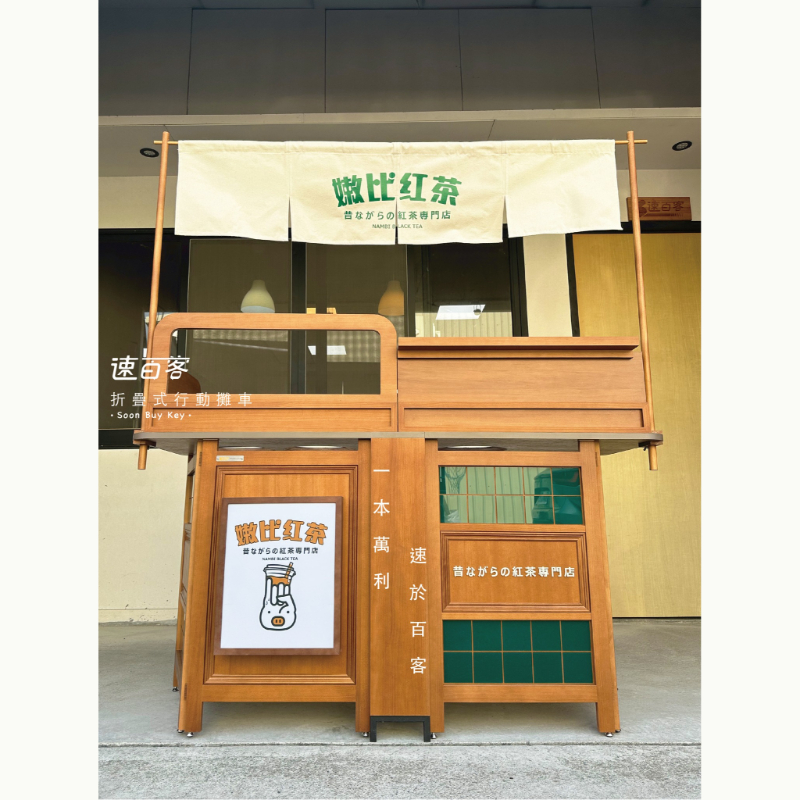 來自高雄的「嫩比紅茶」專賣紅茶飲品, 攤車以溫潤的柚木色為主調作為基底, 搭配仿綠色磁磚裝飾,
