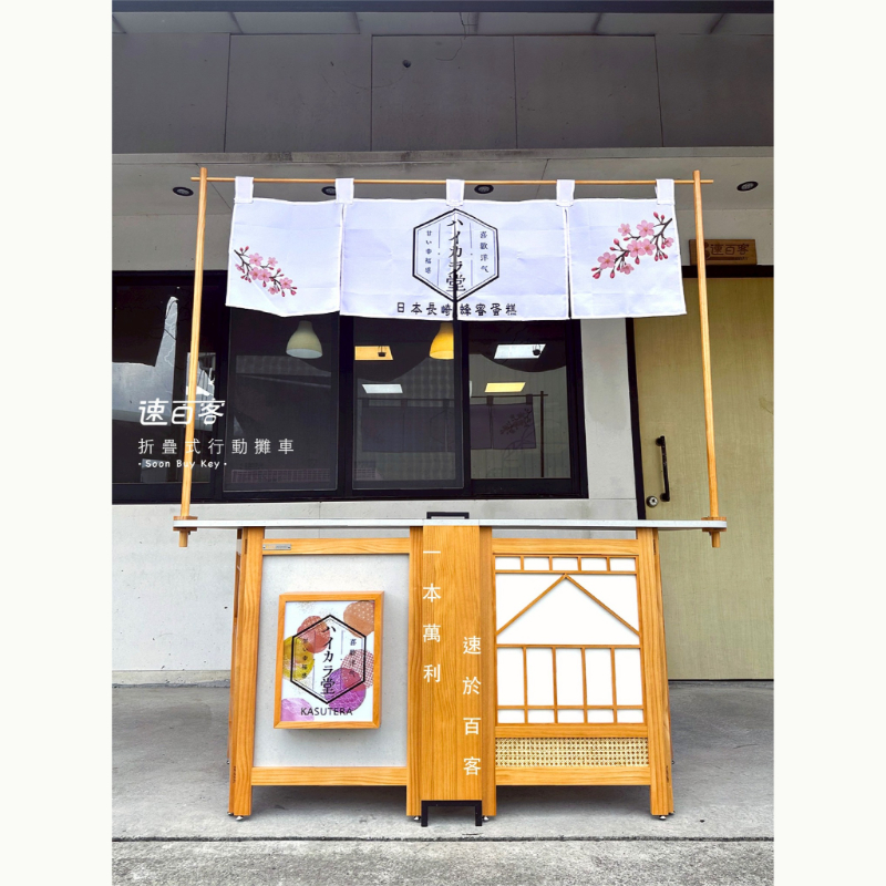 來自台南將軍的「春院子」經營特色民宿, 這台為民宿春院子量身打造的日式風格攤車, 作為下午茶吧台之用也同步販售長崎蛋糕, 設計靈感取自屋頂與窗花的意象,