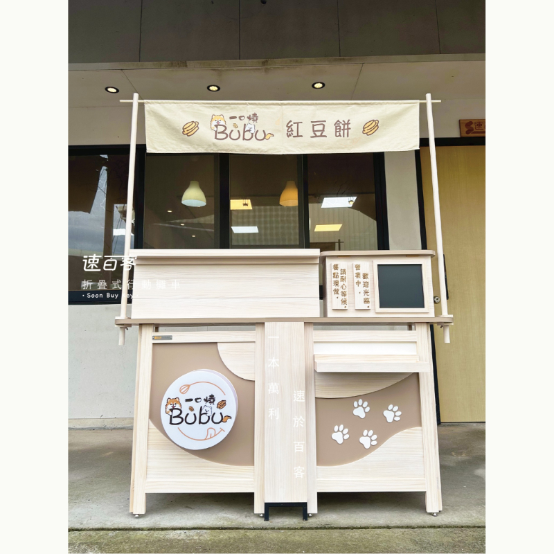 來自台中的「BUBU一口燒」專賣紅豆餅, 攤車設計以自然染白木紋為基底, 融入圓潤造型呼應紅豆餅的溫柔印象,